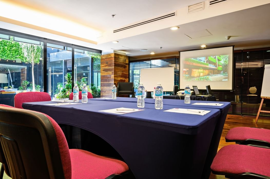 The Wine Room is an intimate and exclusive venue for business events, with a space of 48 m² (516.66 ft²). Additionally, you can enjoy a coffee break on the terrace, which is perfect for focused meetings. For inquiries about availability and pricing, please email us at eventos@lassuites.com.